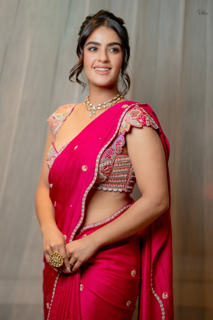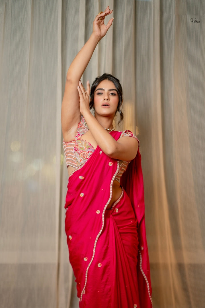 Hot pink silk saree with pearl, zari, kardhana and resham embroidered border and motives all over. Very subtly placed and paired up with a raw silk all over embroidered bralette blouse with reshma, kardhana and pearl detailings.