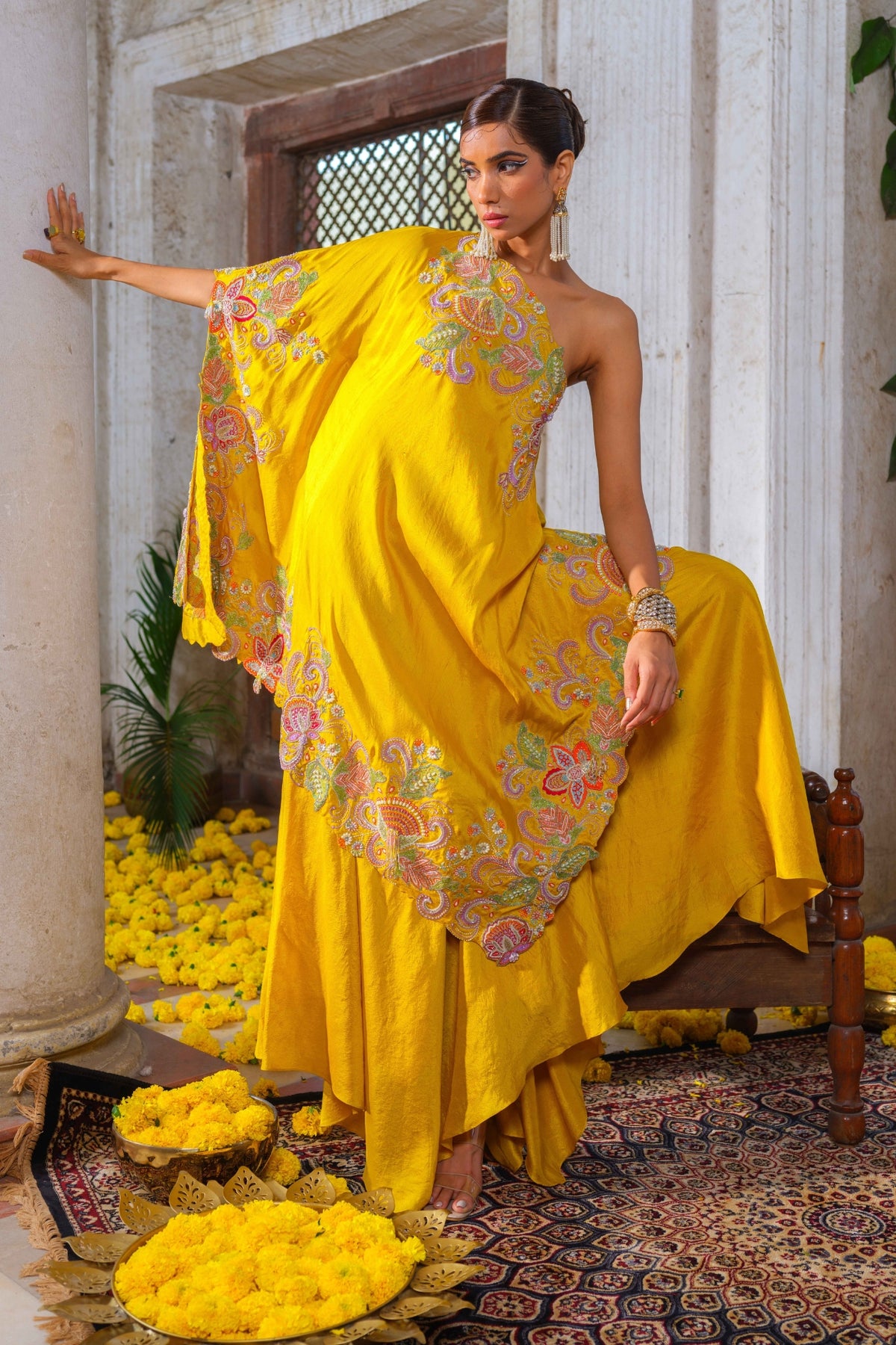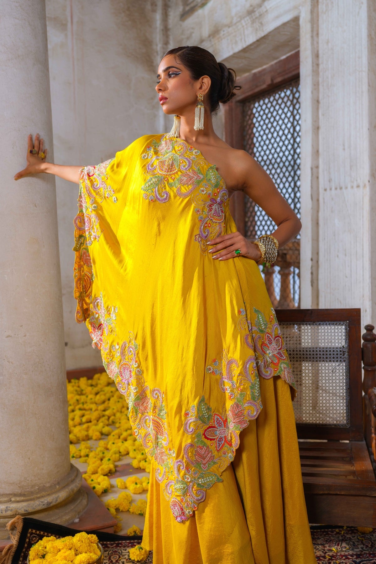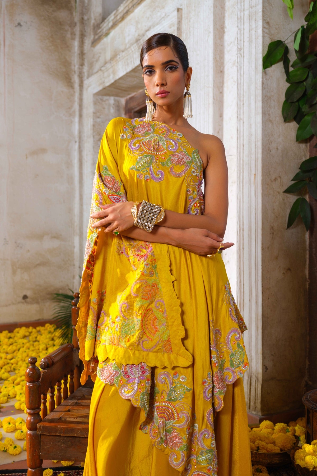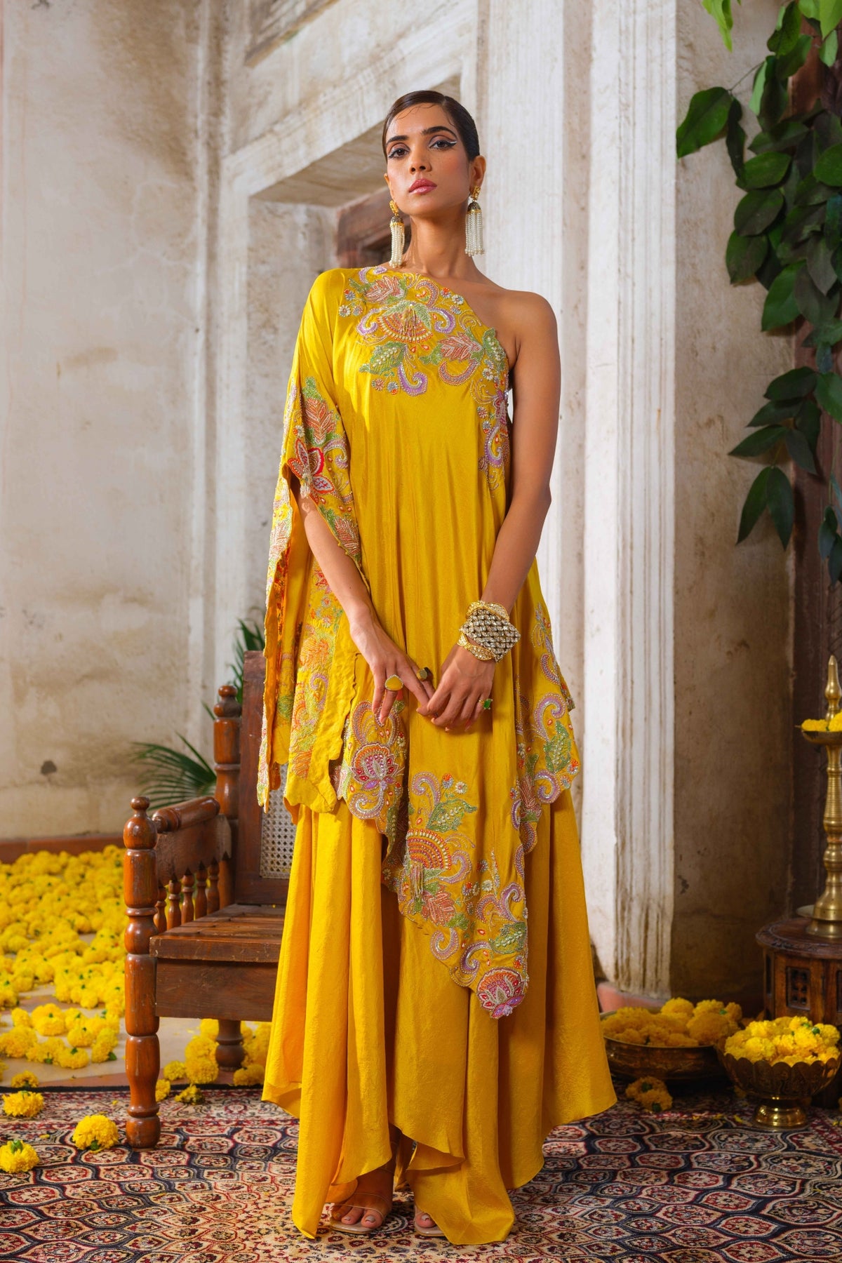 Mustard yellow one shoulder kaftan with vibrant floral multi-colored resham, glass beads, rain-drop pearls and tasselled floral hand embroidery along the neckline, sides and hemline. Paired with mustard yellow pure silk box draped pants.