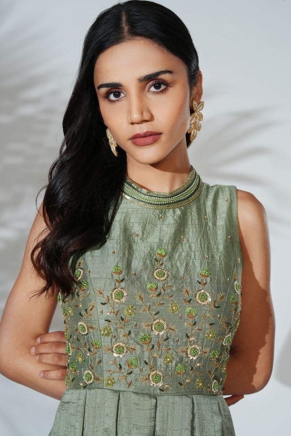 sage green lenin silk body with resham knot & kardhana embroidery with pleated flared jumpsuit