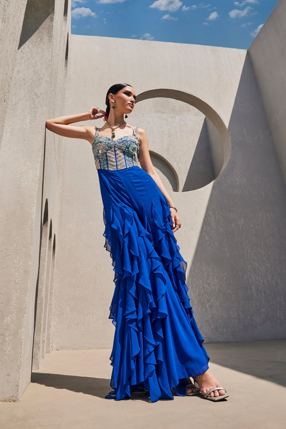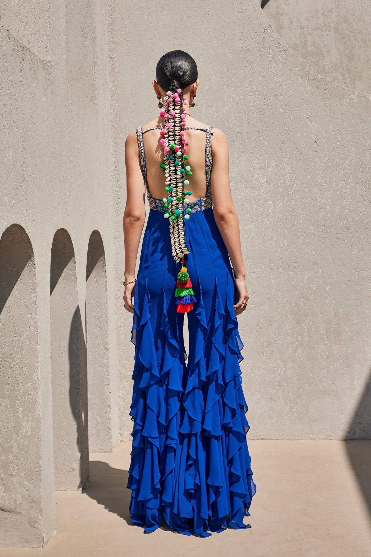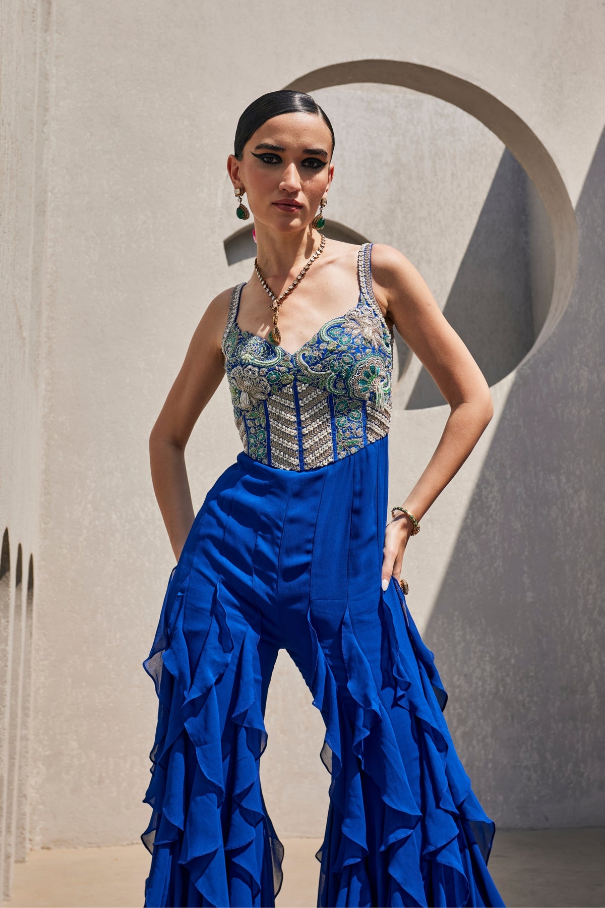 Electric blue ruffled jumpsuit featuring a raw silk corset bodice, intricately embellished with our signature embroidery in tonal Kardhana, resham, glass beads, and drop-shaped pearls.