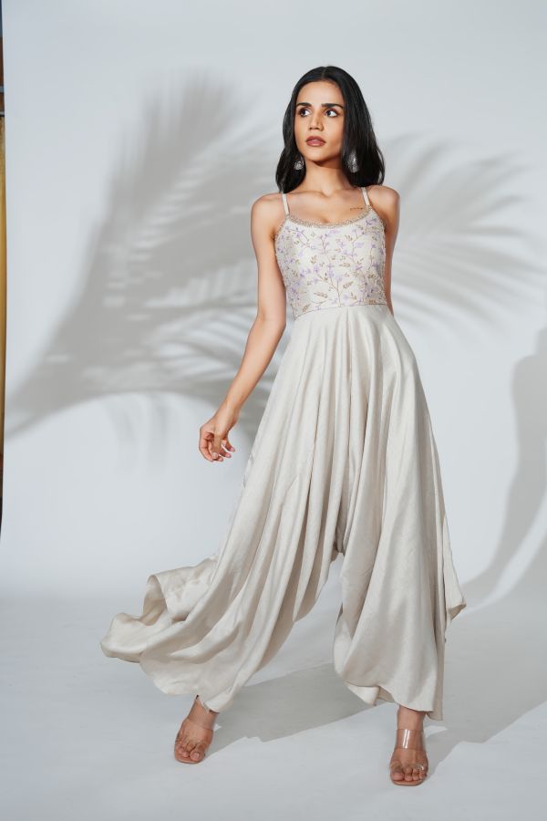 off white lenin silk with resham and zardozi embroidered low crotched jumpsuitFabric: Lenin silkColor: Off whiteNo. Of Component: 1Care: Dry Clean