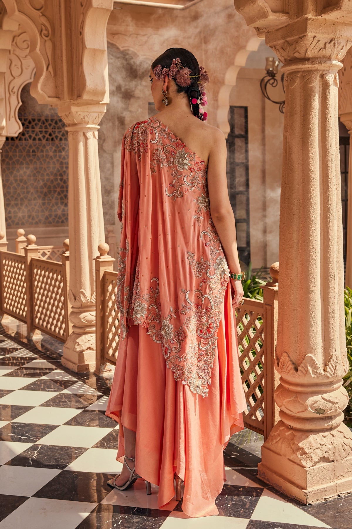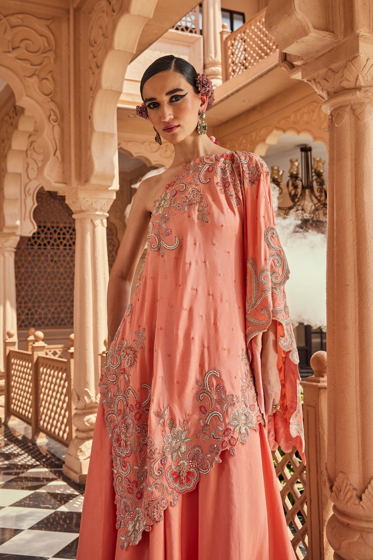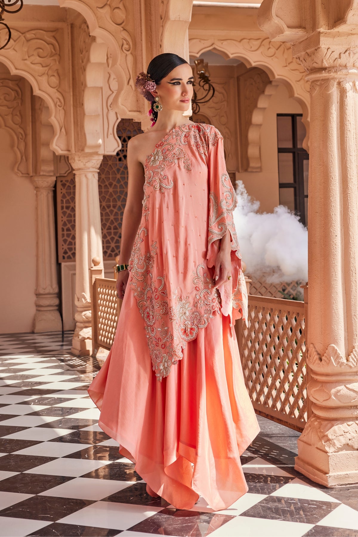 Stunning peach pink one shoulder kaftan with exquisite tonal embroidery with our signature resham work along the neckline, sides and hemline. Paired with peach pink pure silk square pants.