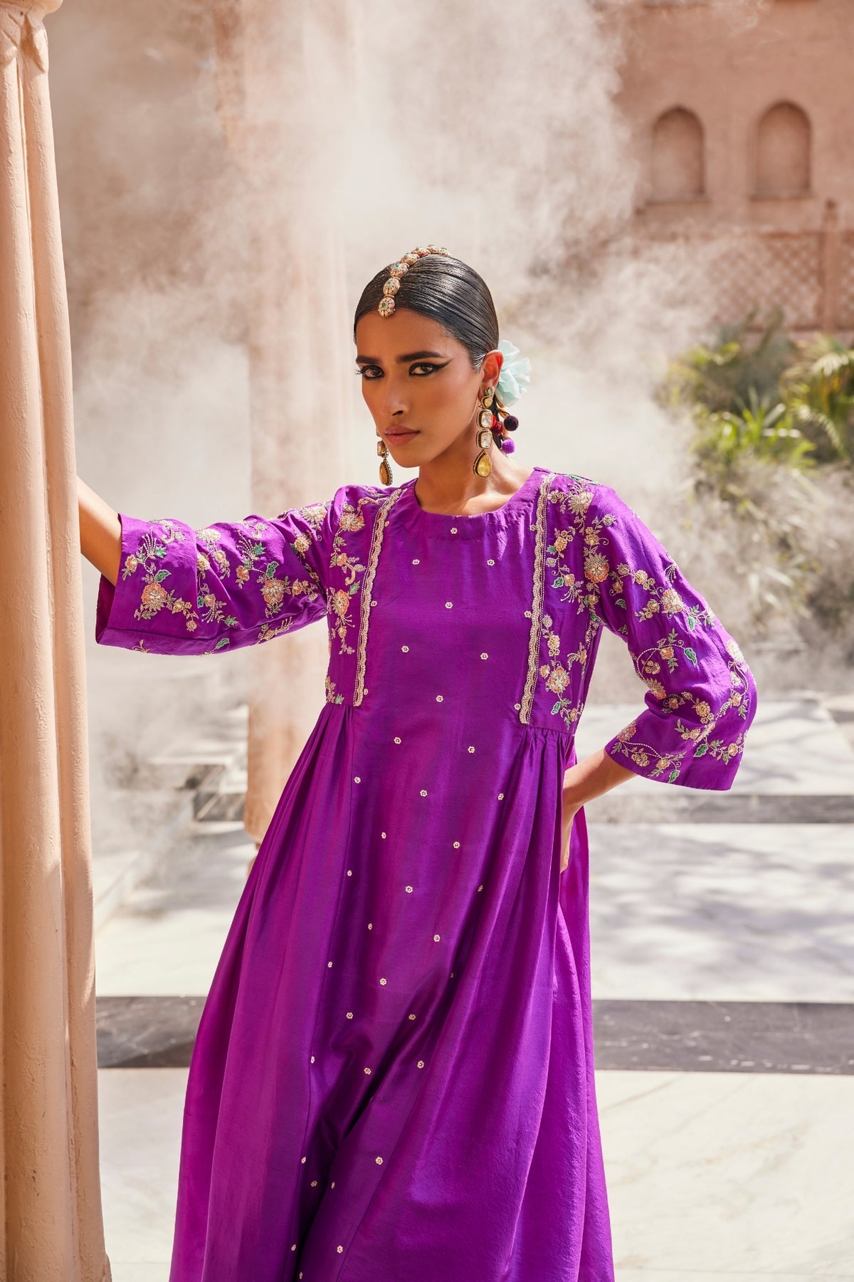 Bright purple pure silk a-line tunic with gathers embellished with our intricate hand embroidery of tonal kardana, resham and zari. Exquisitely paired with bright purple falling raw silk sleek pants.