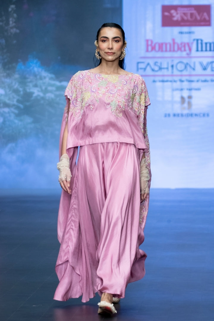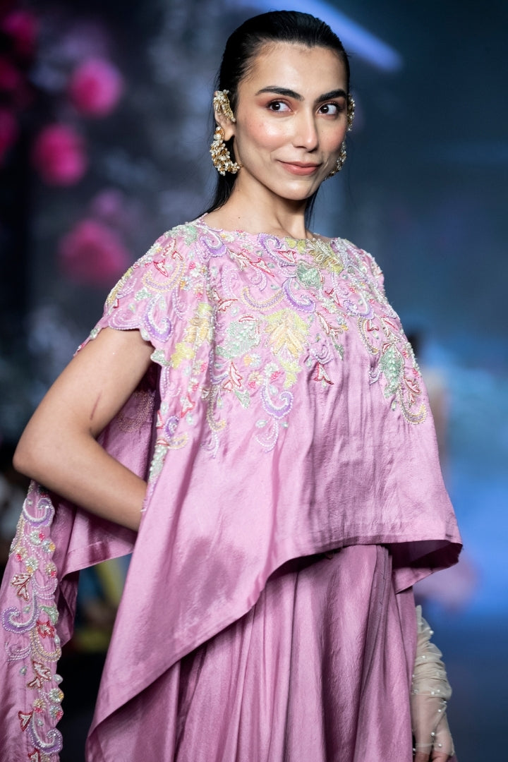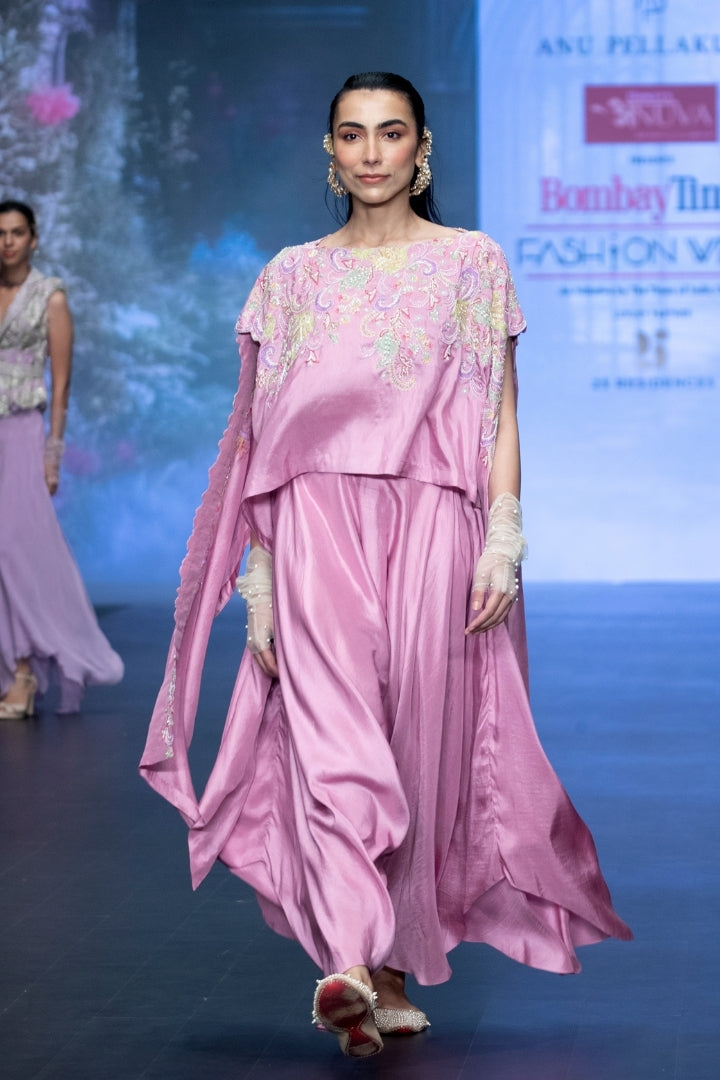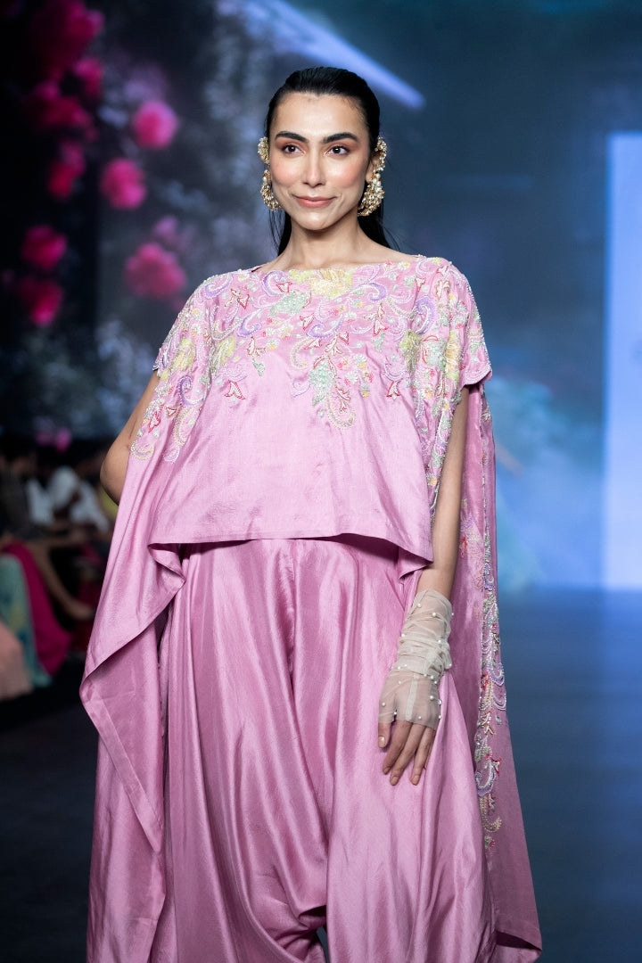 Mauve pink off shoulder kaftan in statement multi-colored resham, glass beads, rain-drop pearls and tasseled floral hand embroidery. Paired with mauve pink pure silk low crotch drape pants.