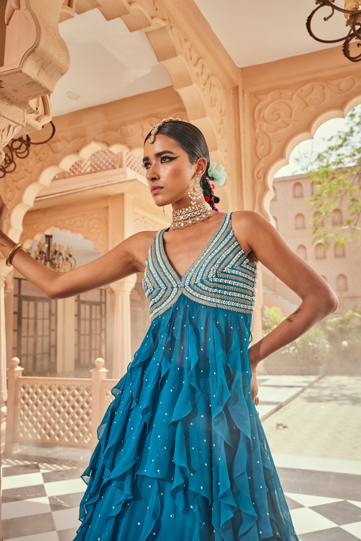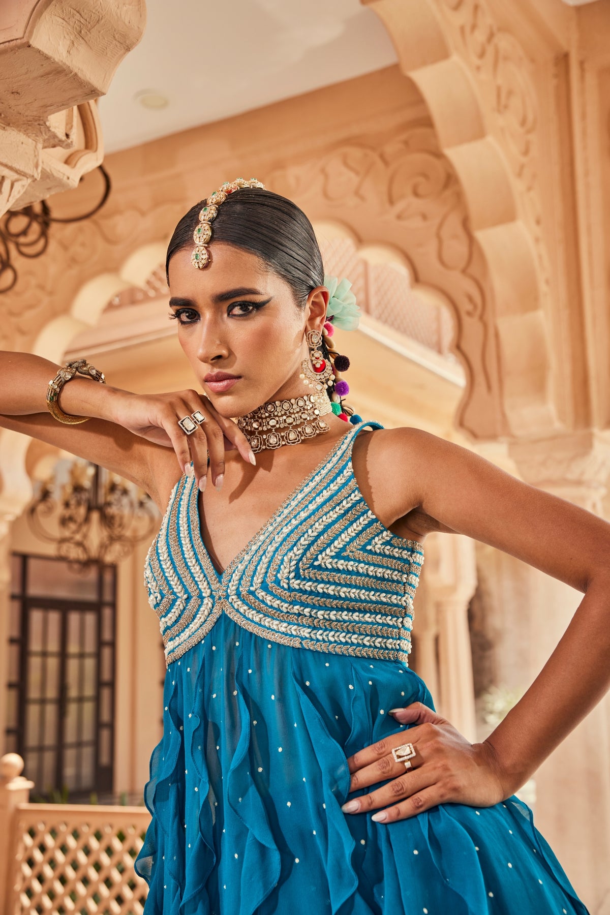 A turquoise blue short Anarkali top featuring hand-embroidered Kardana and rain-drop pearls on the bodice, complemented by a flowing georgette ruffled flare, with scattered pearls . Paired with a matching turquoise blue georgette ruffled lehenga, adorned with pearls all over.