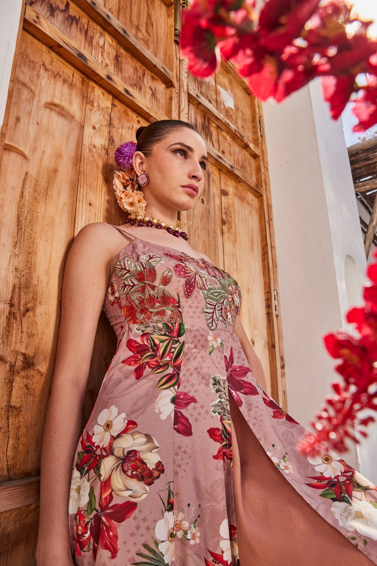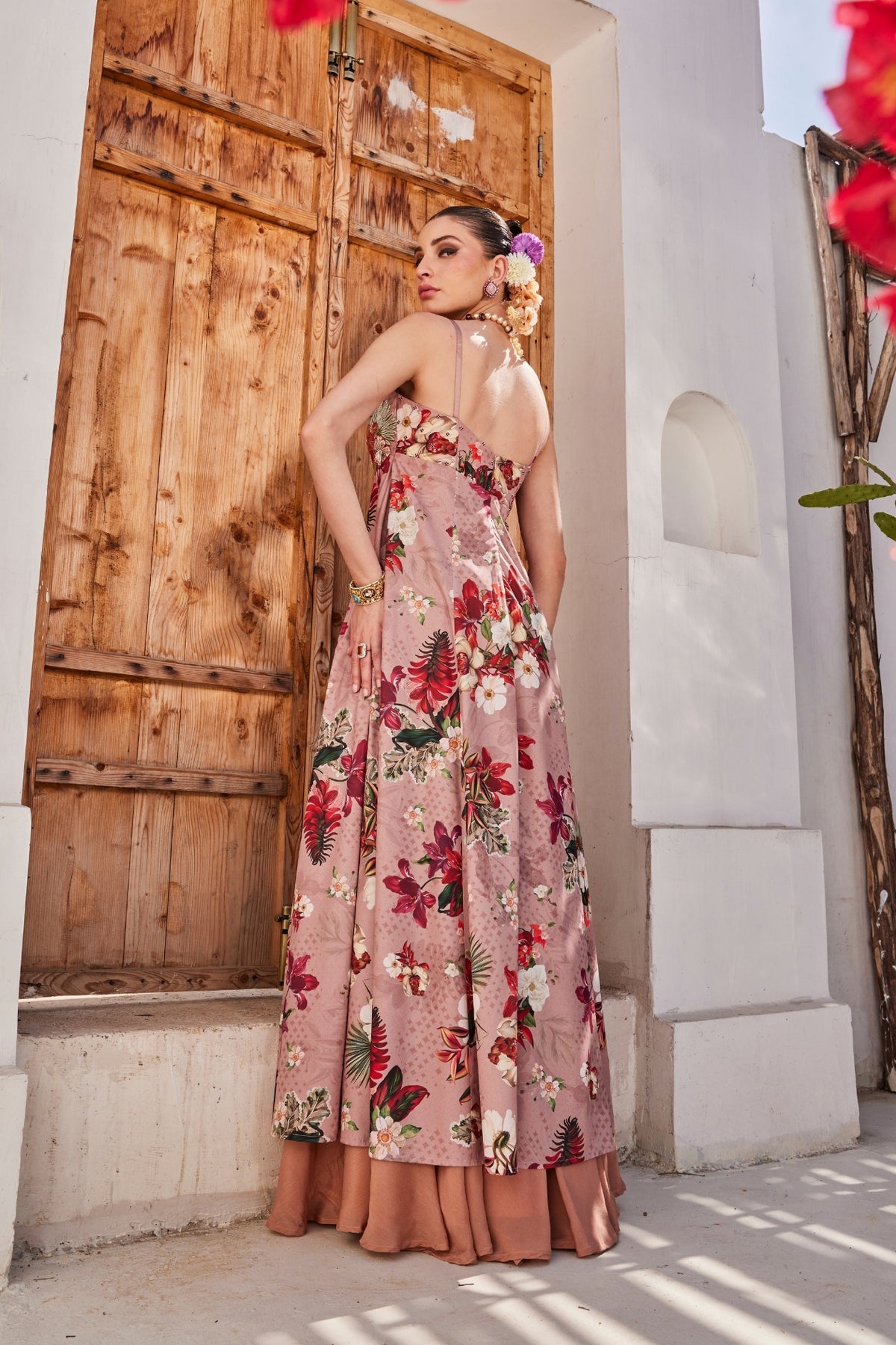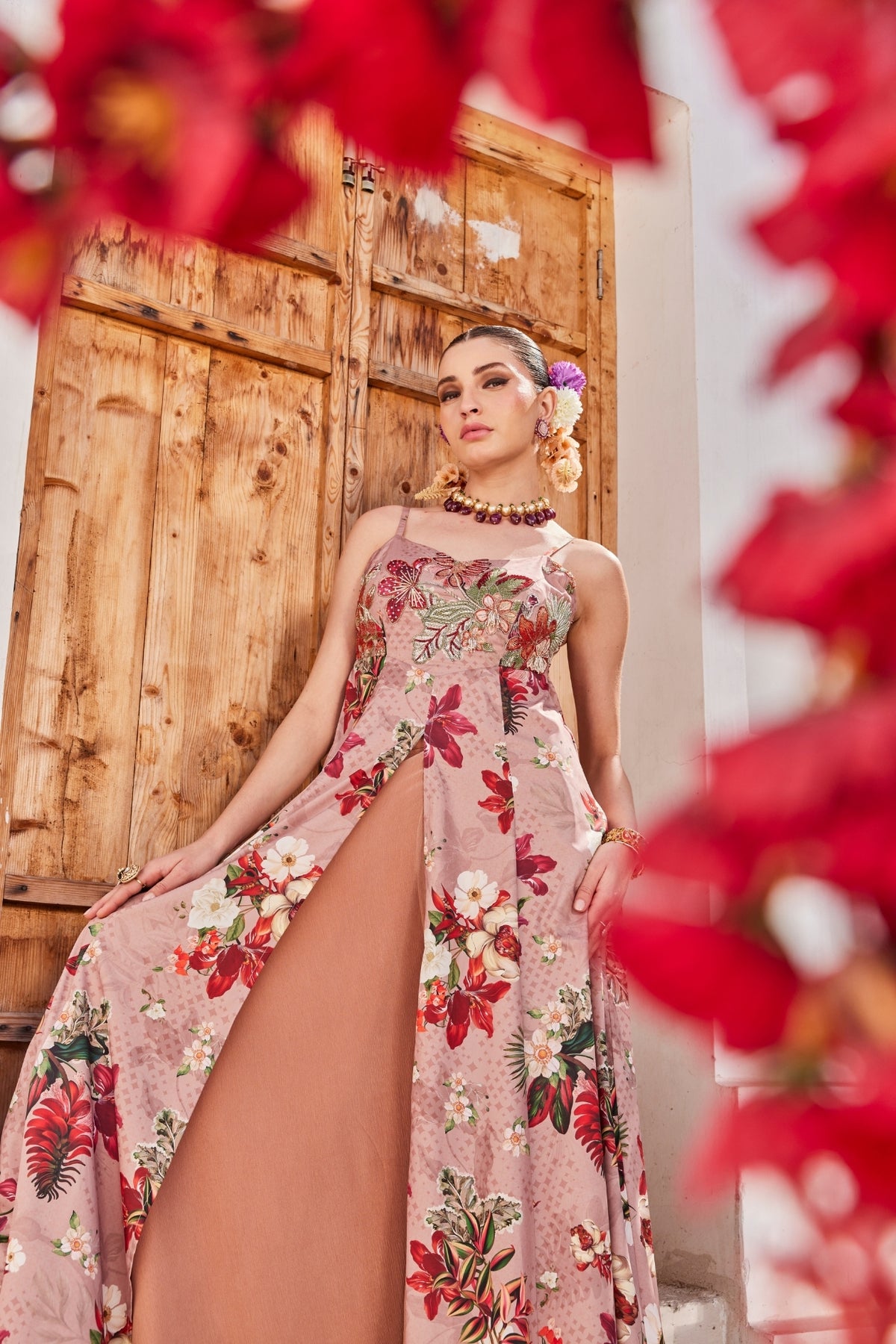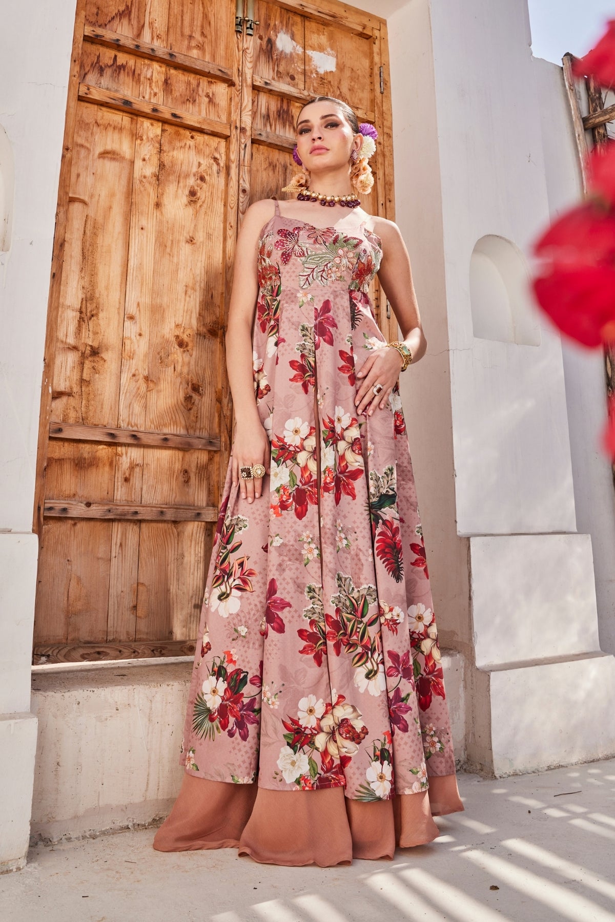 Our patent mauve floral printed front slit anarkali with a structured strappy bodice that makes the dress moves effortlessly with every step.it is paired with chinnon chiffon flared palazzos adding the right drama. The bodice has detailed rich intricate embroidery, adding the beauty to the silhouette.