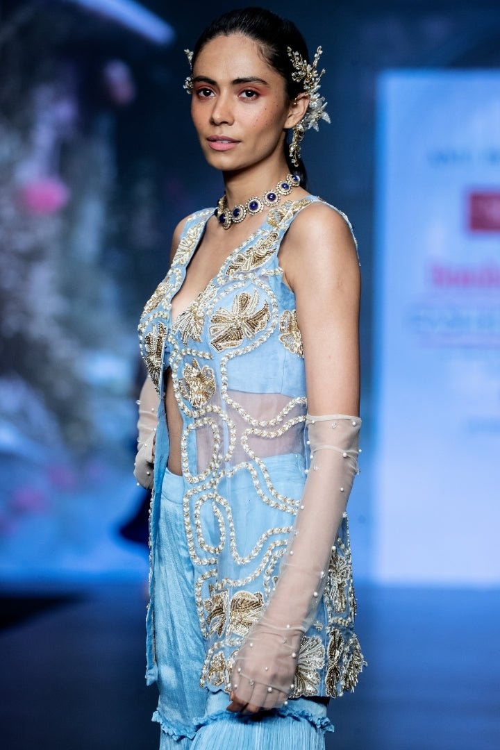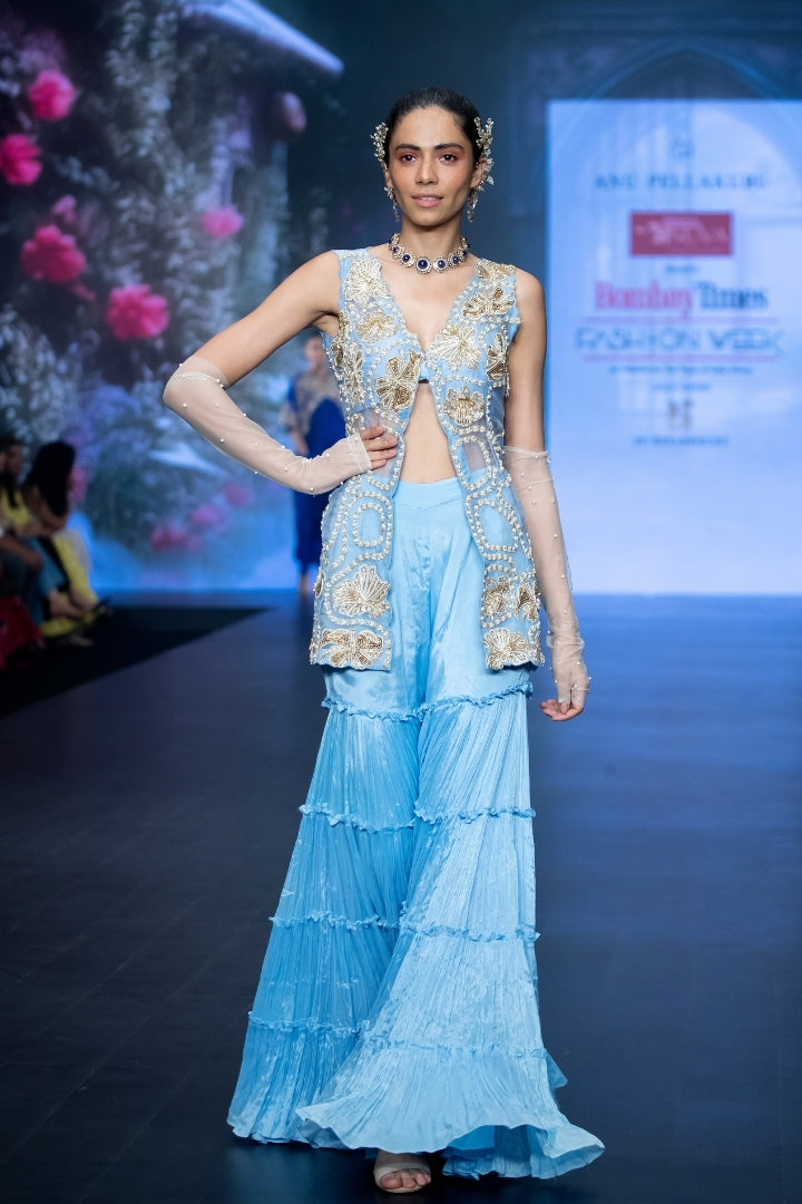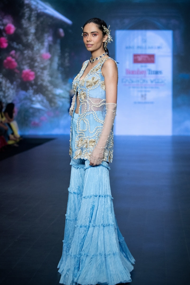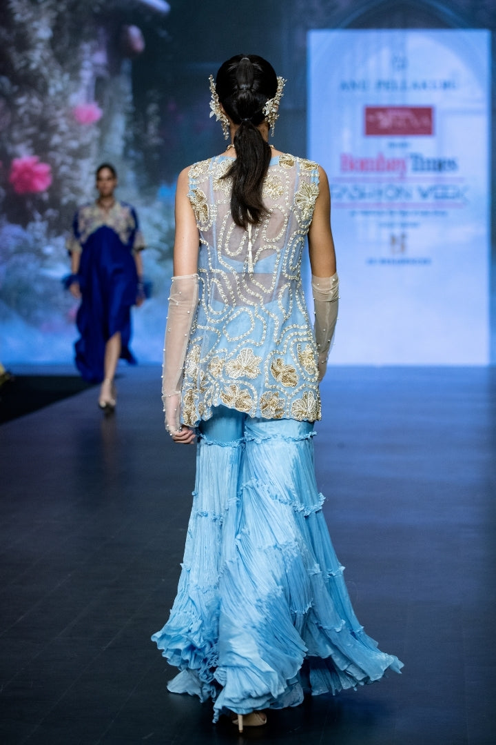 Powder blue organza tunic with intricate golden and white hand embroidery of statement florals in zardozi, zari, rain-drop pearls and glass beads. Paired with our signature tiered powder blue sharara pants and powder blue crop top.
