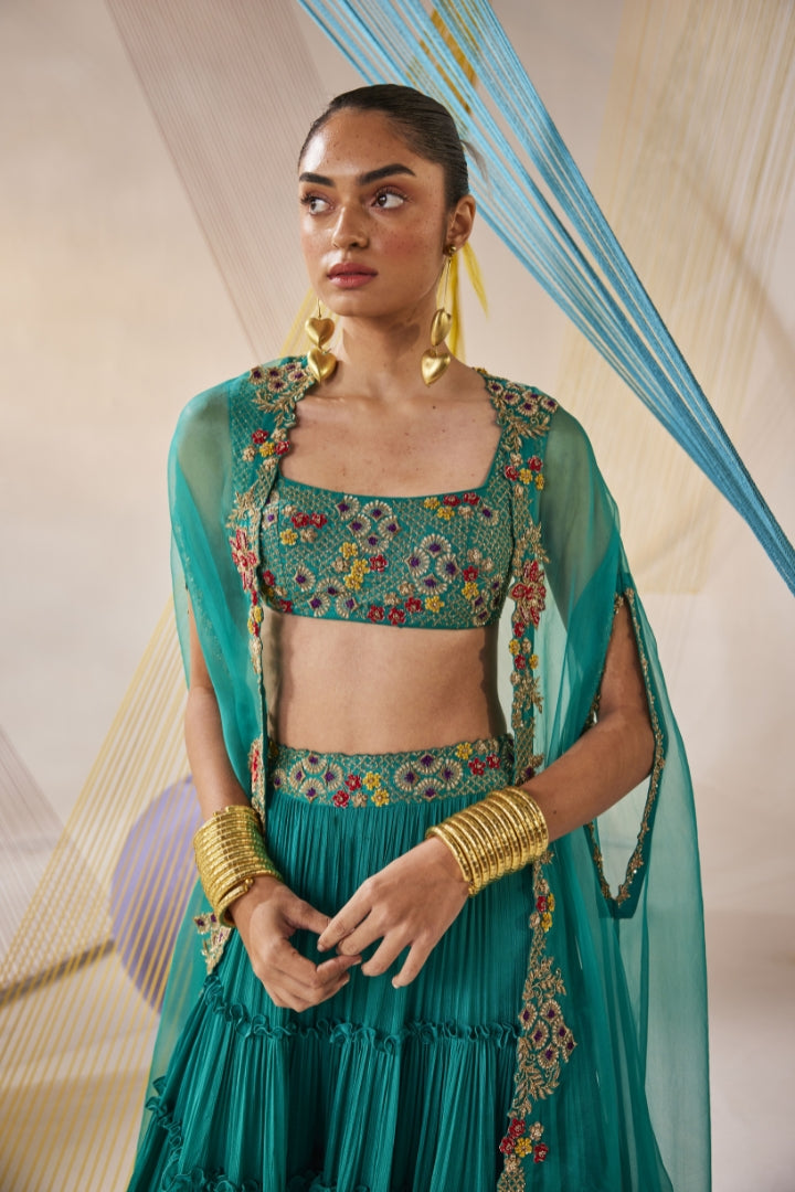 Royal turquoise hand dyed crop top with resham knots and zardozi hand embroidery. Along with meticulous badla jaal texture in the background. Paired with multi-tiered lehenga with a hand embroidered belt and royal turquoise organza cape with zardozi and glistening resham hand embroidery.